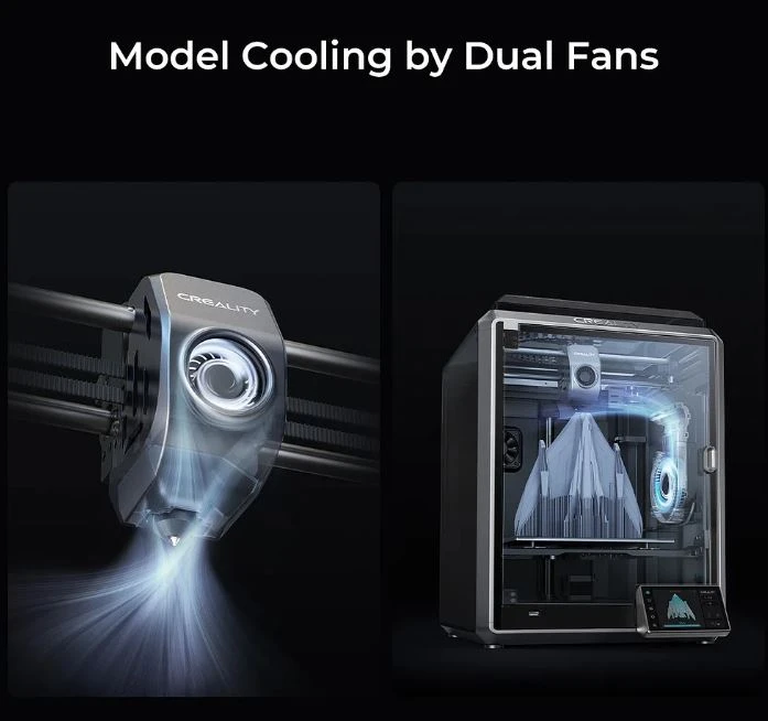 A large fan on the printhead with air ducts cools the model directly. An 18W auxiliary fan in the build chamber enhances the cooling effect, too.